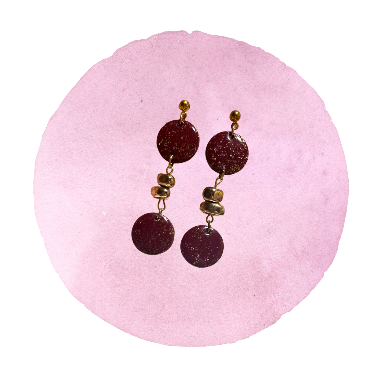 Pendiente de arcilla polimérica formado por piezas circulares y abalorios de acero inoxidable.